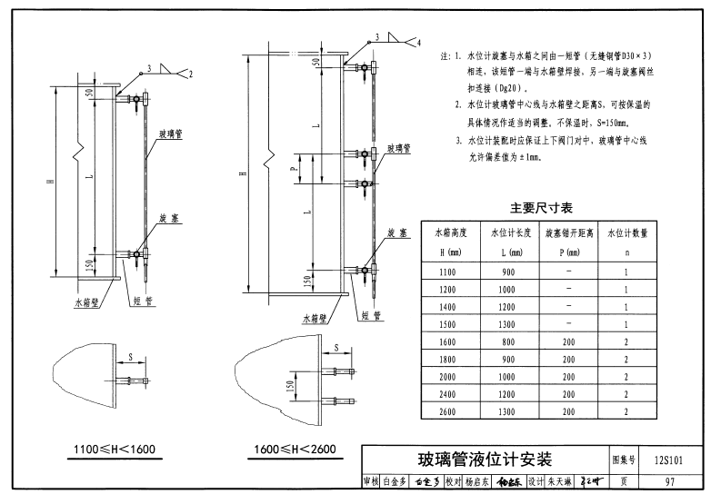 液位計:一般應在水箱側(cè)壁上安裝玻璃液位計,用于就地指示水位。在—個液位計長度不夠時,可上下安裝2個或多個液位計。相鄰2個液位計的重疊部分,不宜少于70 mm,見圖。若在水箱未裝液位信號計時,可設信號管給出溢水信號。信號管一般自水箱側(cè)壁接出,其設置高度應使其管內(nèi)底與溢流管底或喇叭口溢流水面平齊。管徑一般采用DNl5信號管可接至經(jīng)常有人值班房間內(nèi)的洗臉盆、洗滌盆等處。若水箱液位與水泵連鎖,則在水箱側(cè)壁或頂蓋上安裝液位繼電器或信號器,常用的液位繼電器或信號器有浮球式、桿式、電容式與浮平式等。